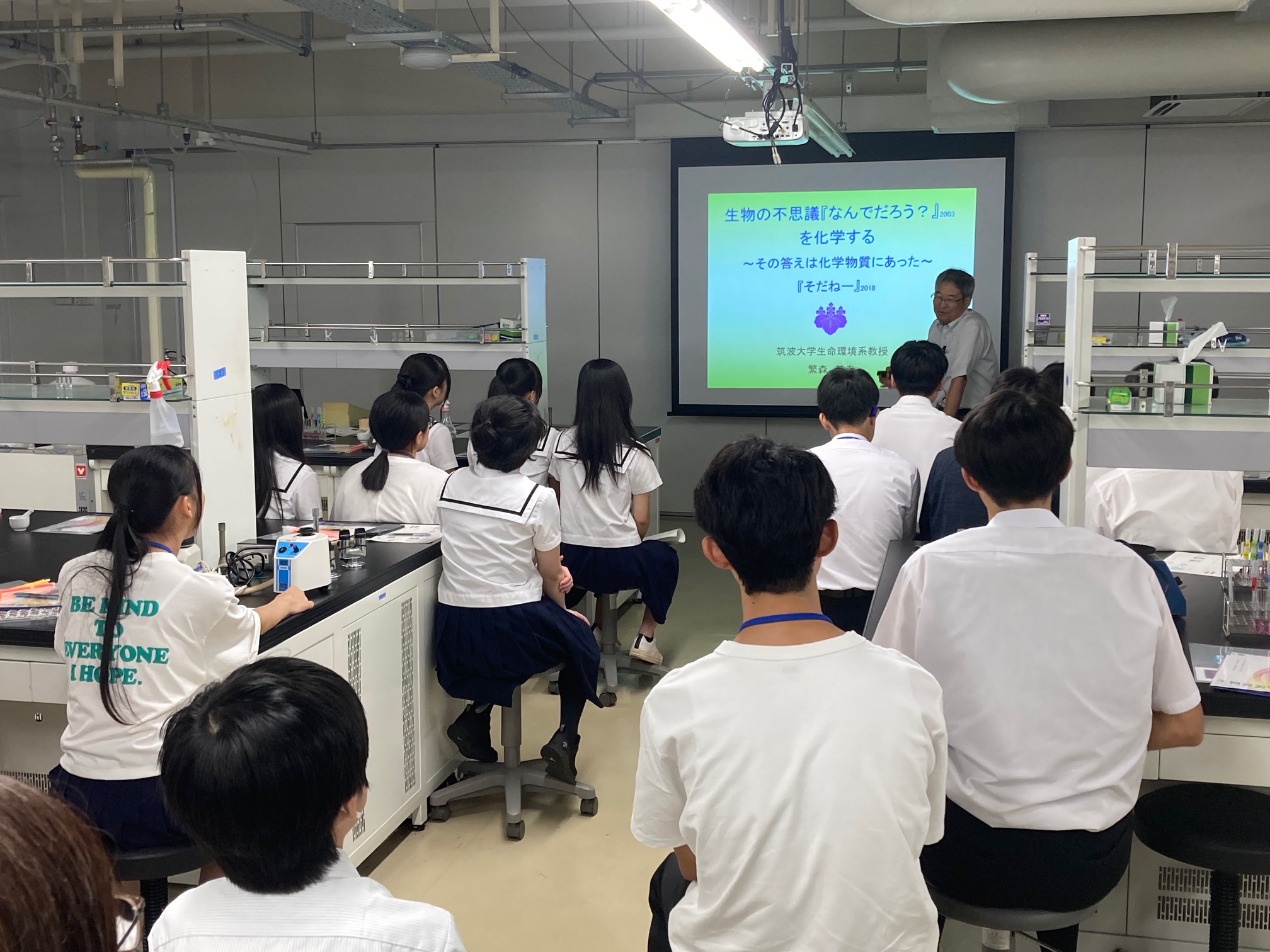 今回は、同校の卒業生でもある生命環境系(生物資源学類)の繁森英幸教授より、「生物の不思議『なんでだろう』 を化学する~その答えは化学物質にあった『そだね』」のタイトルで講義をしていただきました。